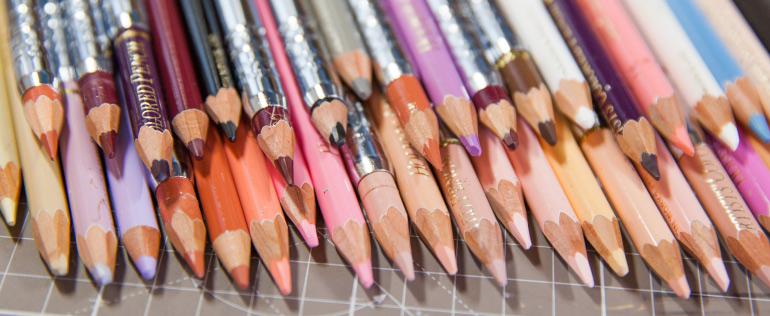 | 下書き・本描き・書き込みに色鉛筆を使用しています。アーティスト用のもので、発色が良く、柔軟性があるので、紙にしっかりと乗ります。人物の顔に合う、ベージュから赤・茶・紫などの色を重点的にそろえています。現場ではよく使う色を何本か持っていき、削る時間を短縮しております。 |