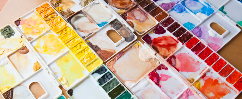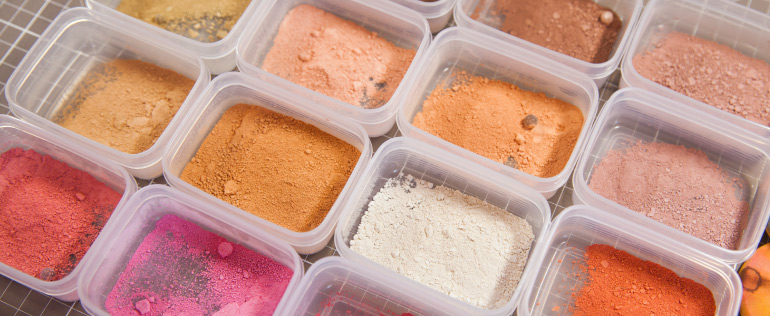| 顔の下地や陰影、頬のぼかしなどにパステルを使用します。粒子の細かさが命なので、乳鉢で磨り潰して使用します。塗る道具は化粧用のパフを使います。 |