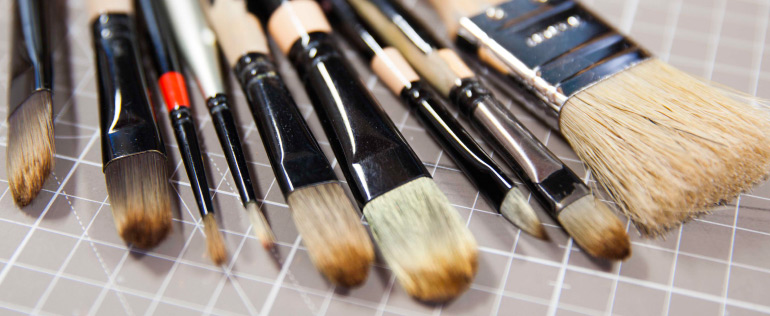 | 筆は水彩用のものをそろえています。よく使うのが太い筆、毛先がしっかりしていて、意外に細かい部分まで描けるので使い勝手が良くて便利。 |