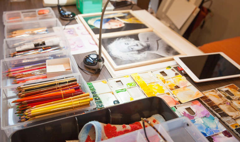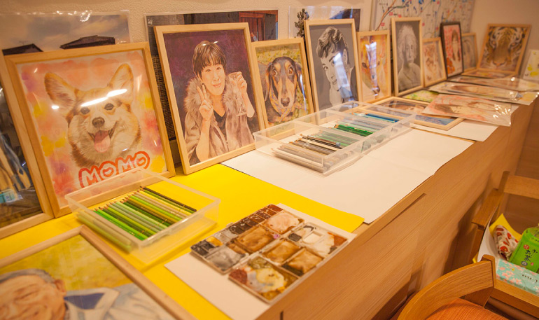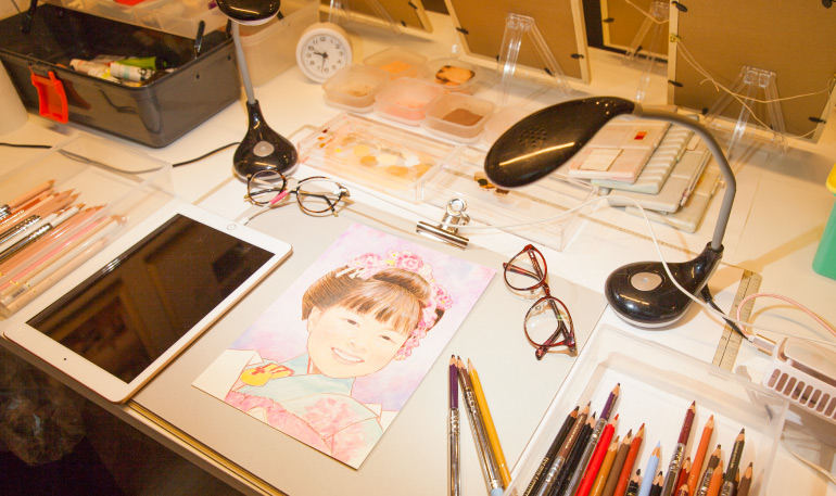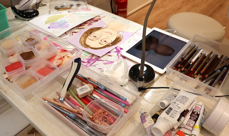 | 今までの似顔絵製作とイラスト製作の経験から、試行錯誤しながら、最適な画材を使用して似顔絵を作成しています。 |