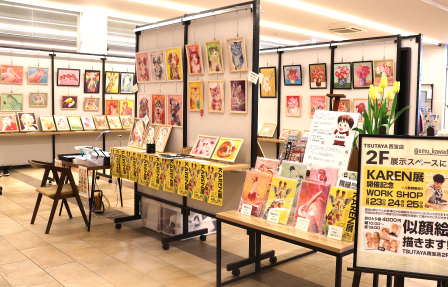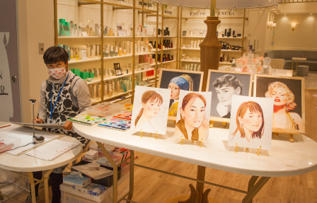 | ーマーが描くということに価値を感じてご依頼くださっているのだと思います。会場の雰囲気づくりや「ここで似顔絵を描いていますよ」ということがわかるように、実際に作成した似顔絵作品を飾らせていただきます。 |