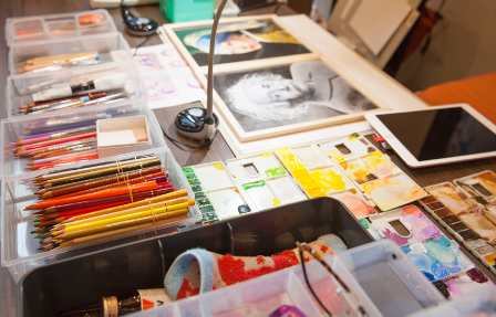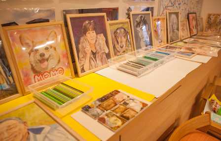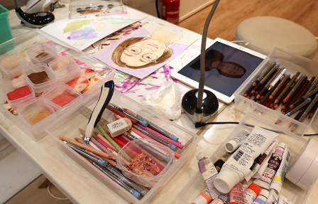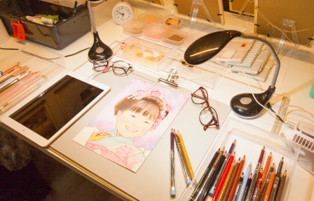 | 今までのイラスト製作の経験から、試行錯誤し、最終的に落ち着いた画材を使用して、似顔絵を作成しております。 |
